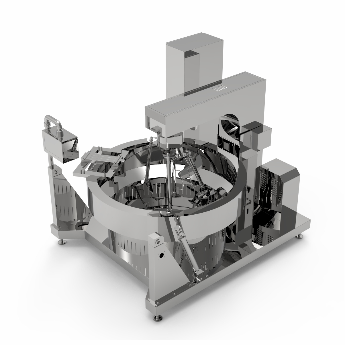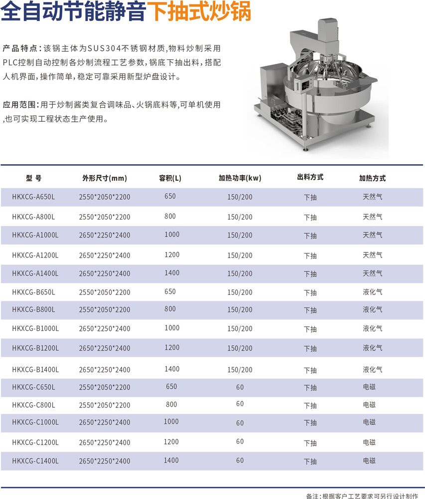 該鍋主體為SUS304不銹鋼材質(zhì),物料炒制采?PLC?動控制各炒制流程?藝參數(shù),液壓翻轉(zhuǎn)出料,搭配?機(jī)界?, 操作簡單,穩(wěn)定可靠,采?新型爐盤設(shè)計。